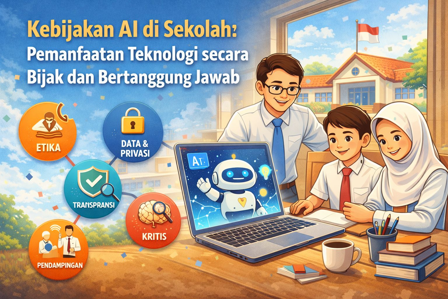 Perkembangan teknologi kecerdasan buatan atau Artificial Intelligence (AI) semakin pesat dan mulai digunakan di berbagai bidang, termasuk pendidikan. Di lingkungan sekolah, AI dapat membantu proses pembelajaran, administrasi, hingga pengembangan kreativitas. Namun, agar pemanfaatannya memberikan dampak positif, sekolah perlu memiliki kebijakan AI yang jelas, bijak, dan bertanggung jawab.